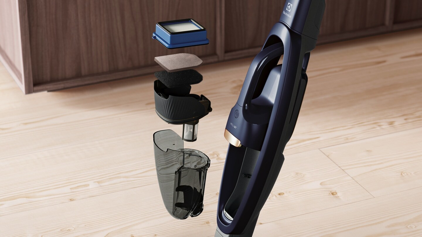 * V porovnání s modelem Electrolux WQ61-42GG na základě interních testů. Výkonnost měřená na základě sběru prachu podle 59F – IEC 62885-2 Edition2 FDIS. Hladina akustického výkonu snížená na polovinu (o 3 dBA), měřeno na ruční jednotce podle ISO 3743.