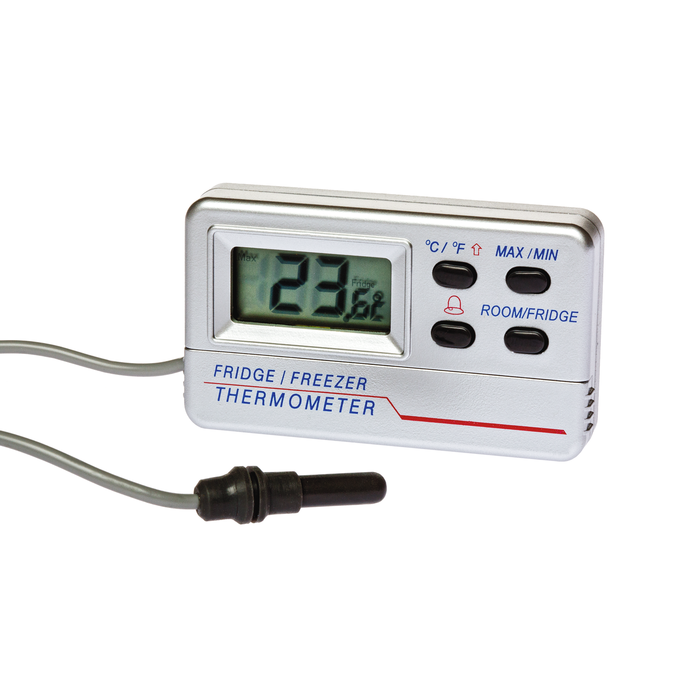 Udržujte svou chladničku a mrazničku ve správné teplotě. Tento digitální teploměr přesně zobrazuje teplotu vaší lednice a mrazáku, což vám umožní vždy udržet potraviny čerstvé a dobře zachovalé. Magneticky přichytitelný a snadno použitelný s alarmem.