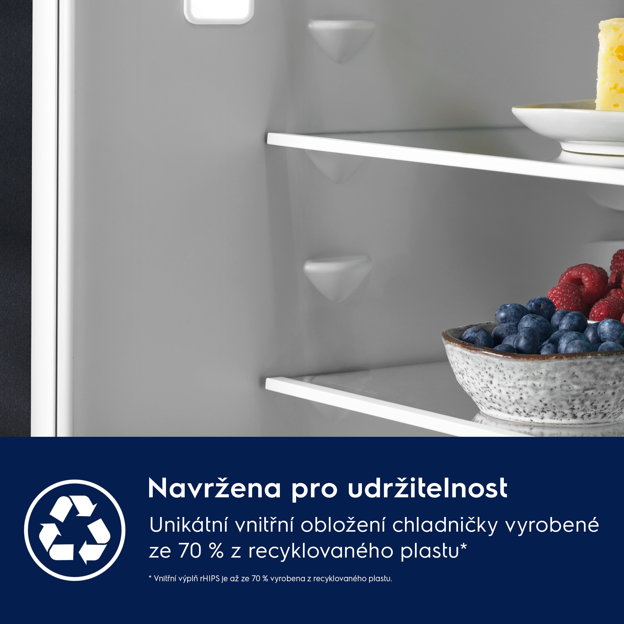 * Vnitřní vložka rHIPS je vyrobena až ze 70 % z recyklovaného plastu, což představuje 13 % z celkového objemu plastů v chladničce.