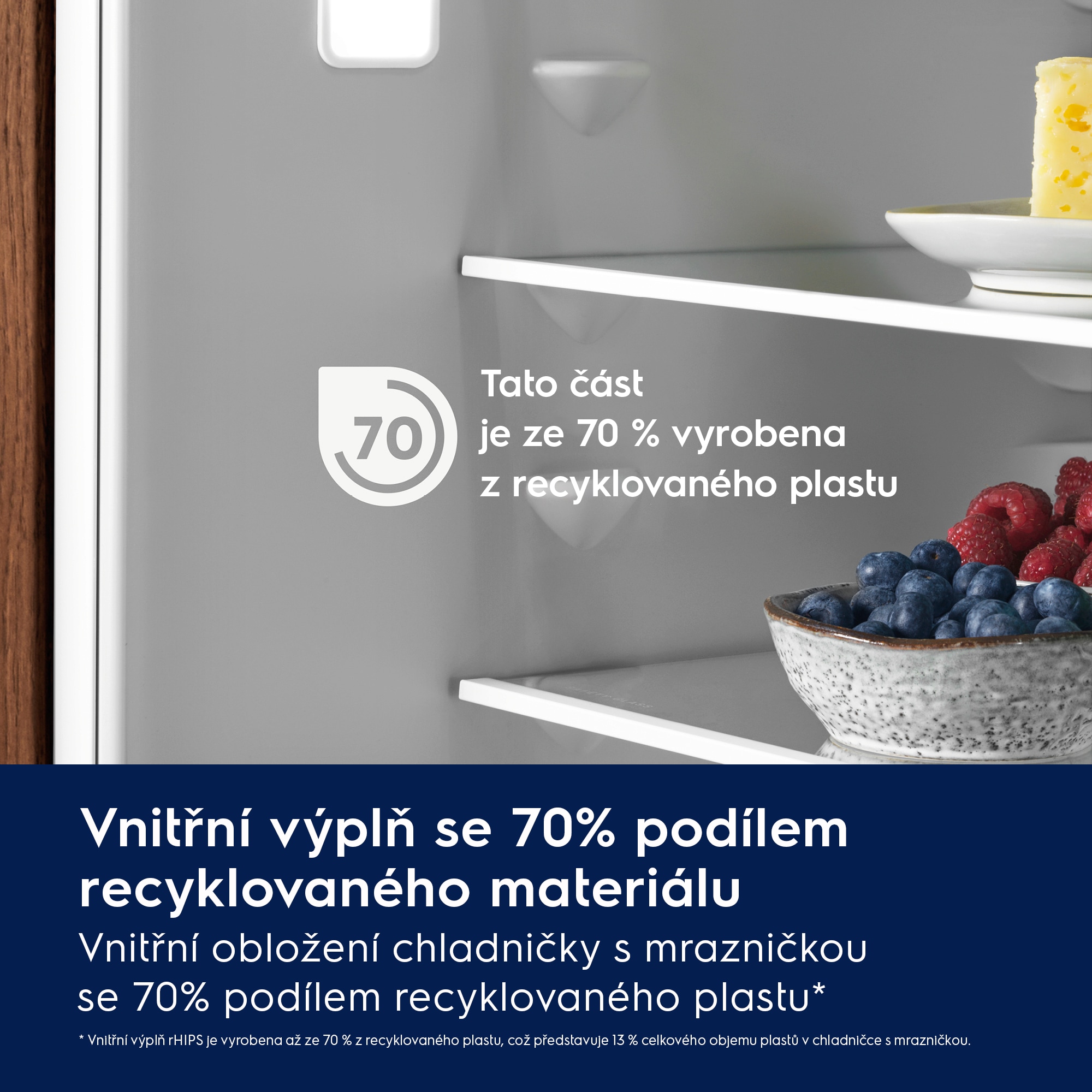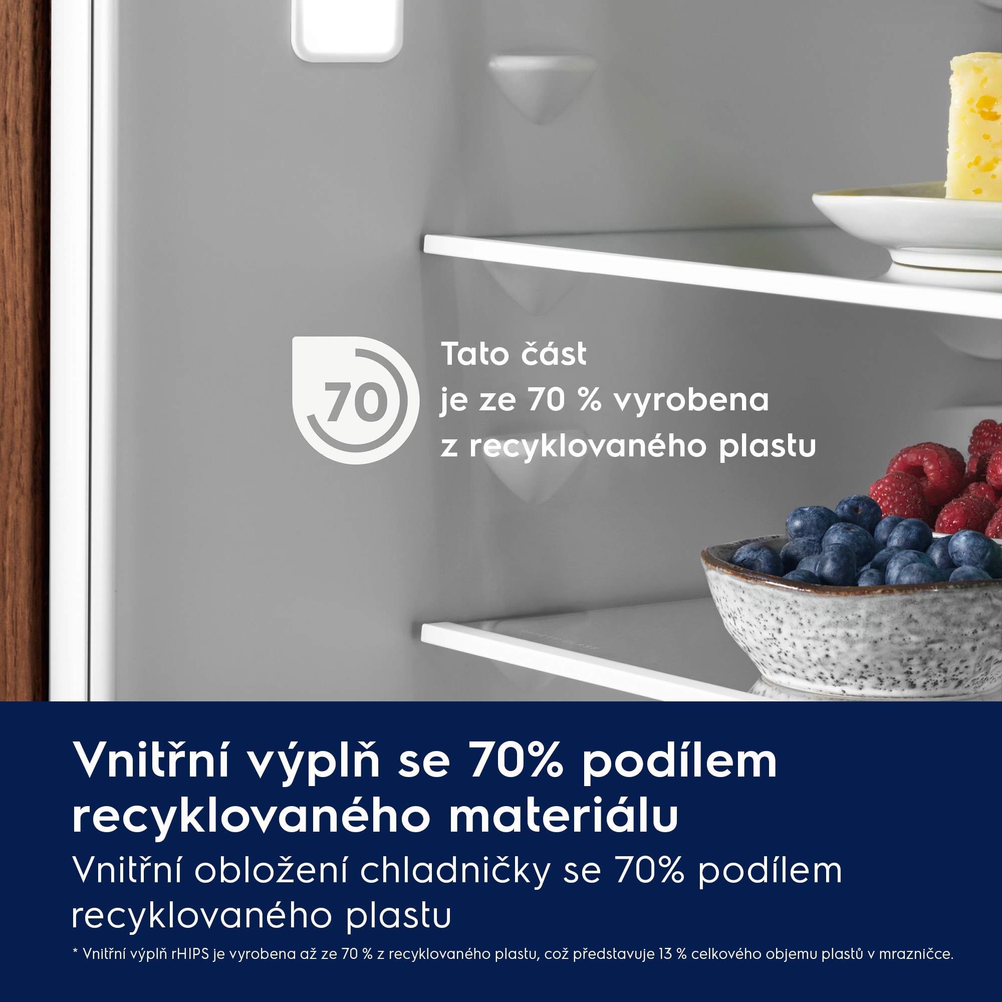 * Vnitřní vložka rHIPS je vyrobena až ze 70 % z recyklovaného plastu, což představuje 13 % z celkového objemu plastů v chladničce.