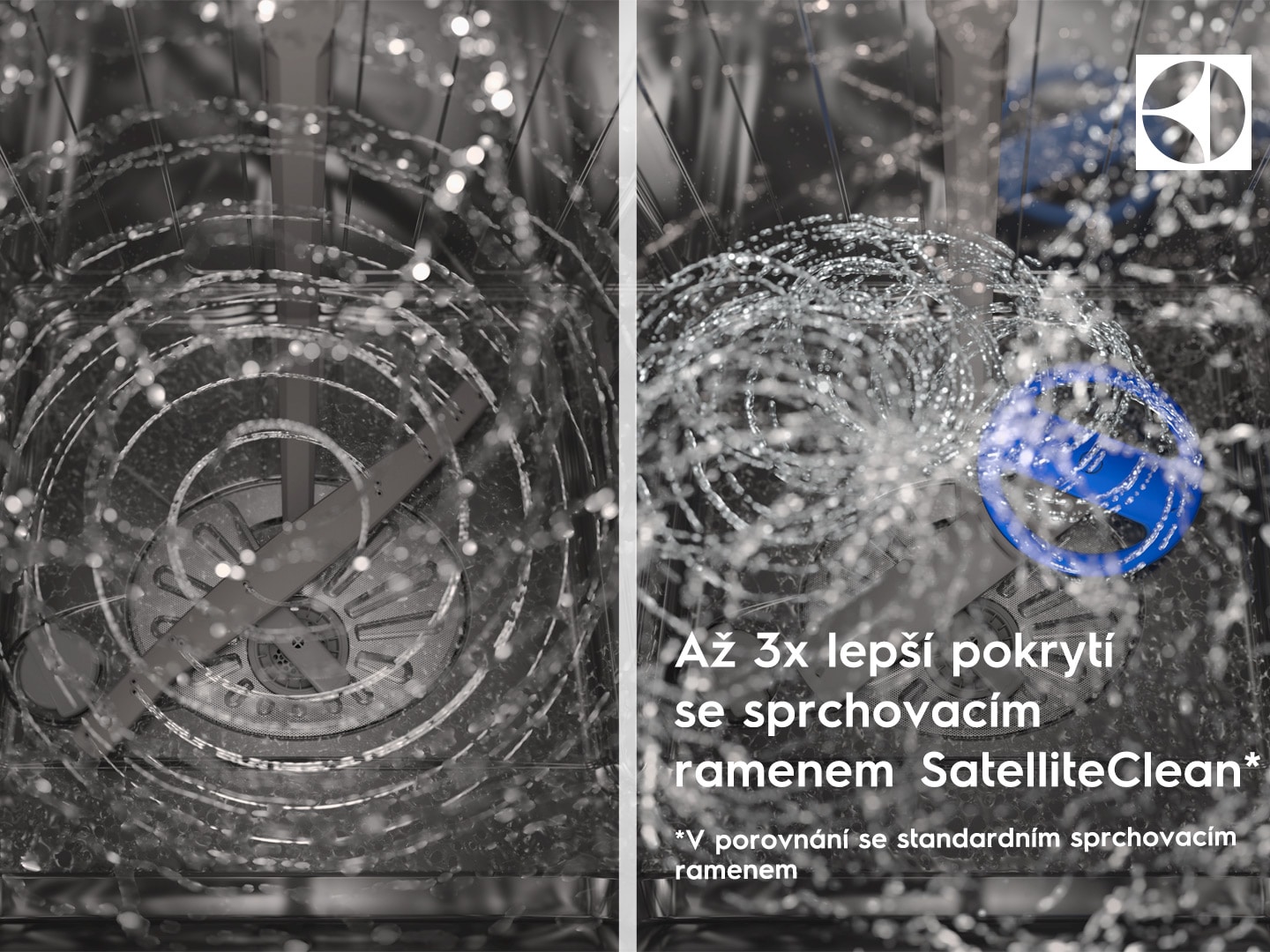 Sprchovací rameno SatelliteClean® zajišťuje maximální pokrytí a dosahuje až 3x lepších výsledků, než je běžné. Dvě rotující ramena neustále mění úhel ostřiku, aby vaše nádobí zářilo čistotou.