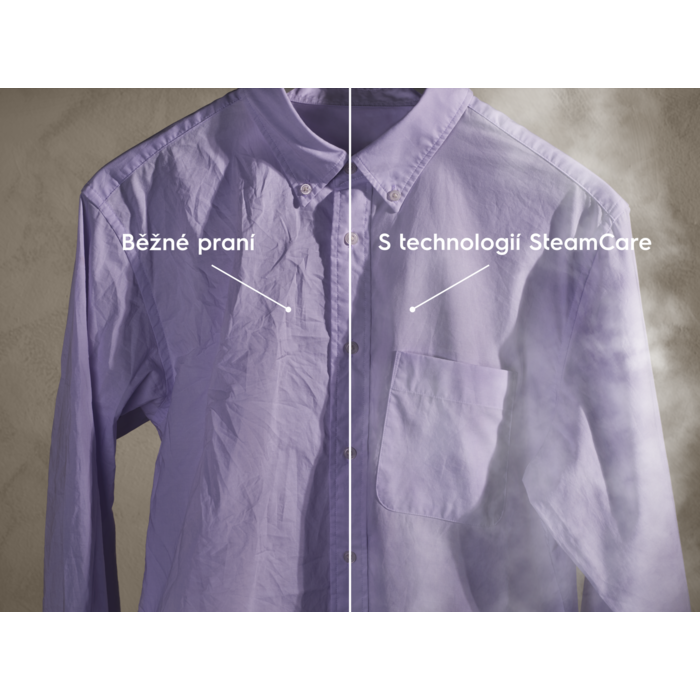 *Interní test a metodologie ukazují až 50% redukci pomačkání u 100% bavlněné tkaniny s využitím režimu SteamCare.