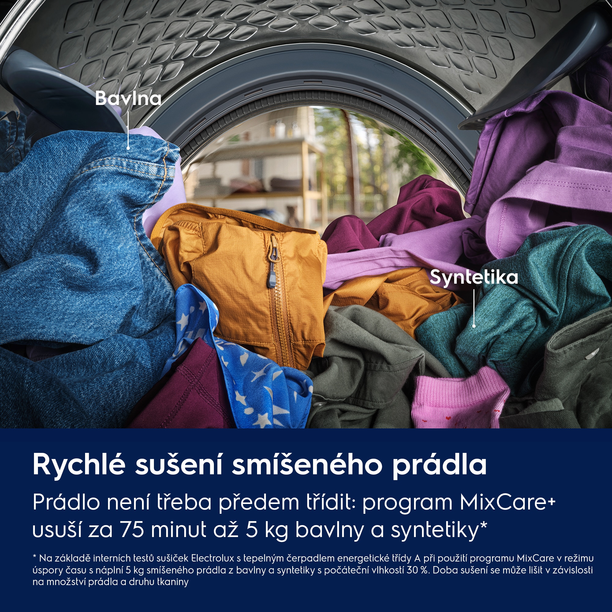 *Na základě interních testů porovnávajících sušičky Electrolux energetické třídy A s tepelným čerpadlem v režimu úspory času a úspory energie se sušičkami Electrolux energetické třídy B při 179minutovém sušení 8kg náplně v programu MixCare.