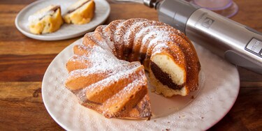 3. Bábovku pečeme cca 40 minut. Až na povrchu zezlátne, zkusíme zapíchnout špejli. Pokud se těsto nelepí, je hotová. Bábovku přendáme na mřížku a necháme vychladnout. Pak ji vyklopíme a posypeme moučkovým cukrem.