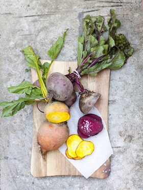 2 červené řepy, 2 oranžové řepy, hrubá mořská sůl, 3 snítky tymiánu, olivový olej