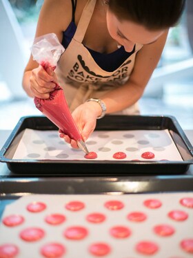 Plechy si vyložte pečícím papírem, pod který můžete dát šablonu s předtištěnými vzory makronek. Na plech nastříkáme směs. Šablonu poté vyndáme a s plechem silně bouchneme o stůl tak, aby se uvolnily vzduchové bublinky a praskly. Makronky necháme zaschnout na plechu asi 30-60 minut. Ideální je, pokud se po této době můžeme makronek zlehka dotknout a hmota se nám nepřilepí na prst.