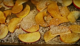 Jablka zbavíme jádřinců, rozpůlíme a nakrájíme na tenké plátky. Vyložíme je na plech, pokapeme citronovou šťávou a rovnoměrně posypeme skořicovým cukrem. Parní troubu nastavíme na nejvyšší stupeň a plech s jablky vložíme na 5 minut. Vyndáme a necháme vychladnout při pokojové teplotě.