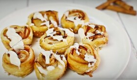 270 g čerstvého másla, 1 balení listového těsta, 2 jablka, 4 PL skořicového cukru, šťáva z půlky citronu, 20 g másla, 90 g mascarpone, 2 PL mléka, 50 g moučkového cukru