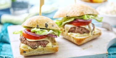 400−600 g mleté hovězí plece, 4 plátky sýra gouda, 50 ml olivového oleje, 100 g ledového salátu, 100 ml majonézy, 2 rajčata, 1 červená cibule nakrájená na plátky, sůl, pepř, 4 malé ciabatty