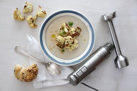 2. Mezitím si připravte pečený květák. Předehřejte si troubu na 200 °C. Růžičky květáku obalte ve směsi koření a soli. Přendejte je na plech vyložený pečicím papírem, zakapejte olivovým olejem a pečte dozlatova, asi 15 minut.