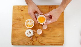 Nejdříve si připravíme vajíčka. Čtyři jakékoli mističky vyložíme potravinářskou fólií tak, aby přesahovala přes okraje. Fólii potřeme olivovým olejem. Do každé mističky vyklepneme vajíčko, osolíme a fólii pečlivě zavážeme kuchyňským provázkem.