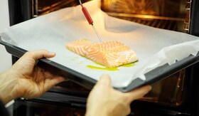 Lososa opláchneme pod tekoucí vodou a osušíme. Filet potřeme olivovým olejem, osolíme a přendáme na plech s pečicím papírem. Do středu masa zapíchneme teplotní sondu. Vajíčka vyjmeme z misek a položíme je na plech k rybě. Dáme do předehřáté trouby na režim Vaření v páře 80 °C, sondu nastavíme na 60 °C.