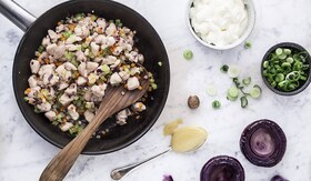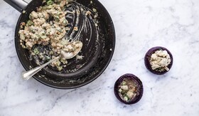 Přísady na plněnou cibuli s králičím ragú a hráškovou quinoou