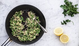 100 g sušené quinoy, 100 g mraženého hrášku, ½ ks cuketa střední, 40 g másla, šťáva z poloviny citronu, 1 lžíce lístků z máty, sůl