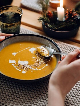 3. Polévku poté přelijte do hrnce, zahřejte a případně ještě dochuťte. Při podávání můžete zakápnout smetanou pro zjemnění a ozdobit nasucho opraženými semínky a oříšky.