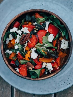2 hrsti salátových listů (např. dubový a ledový), 1/2 menší dýně hokaido, 1/2 červené papriky, 2 lžíce dýňových semínek, 2 lžíce pekanových ořechů, 100 g balkánského sýra, sůl, pepř, olivový olej, balzamikový ocet, citronová kůra