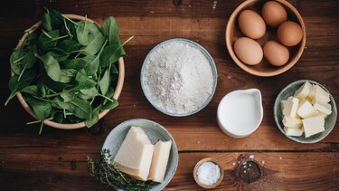Na náplň: 80 g čerstvého špenátu, 300 ml 30% smetany, 2 vejce, 100 g strouhaného parmezánu, čerstvý tymián, sůl, pepř