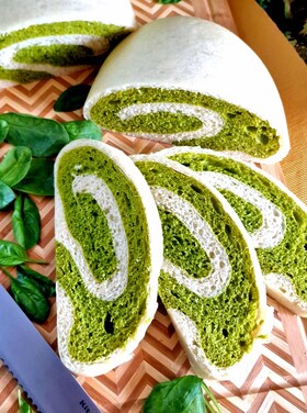 - Vykynuté bílé těsto jemně rozválíme na tloušťku asi 1,5 cm. Na bílé těsto dáme špenátové těsto a jemně protáhneme nebo vyválíme na velikost bílého.