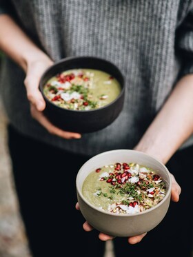 - Smoothie rozlijte do dvou misek a ozdobte granátovými semínky, nasekanými mandlemi a pistáciemi. Zasypte kokosovými lupínky a řeřichou.