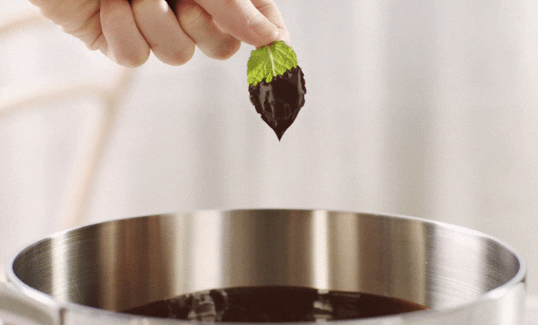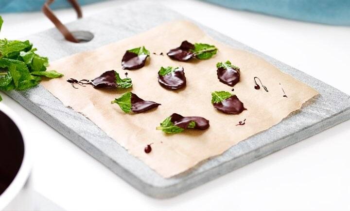 Vytvořte originální sladkou jednohubku s osvěžující chutí - mražené mátové lístky v čokoládě. Skvěle chutnají sami o sobě nebo s nimi můžete ozdobit váš dezert. Hodí se báječně na dorty i domácí zmrzlinu. Při rozpouštění čokolády na indukční varné desce ani nemusíte využívat vodní lázně, stačí zapnout indukci na nízký výkon. Vyzkoušet můžete i další bylinky, které si dobře rozumí s čokoládou - například bazalku, šalvěj nebo levanduli.