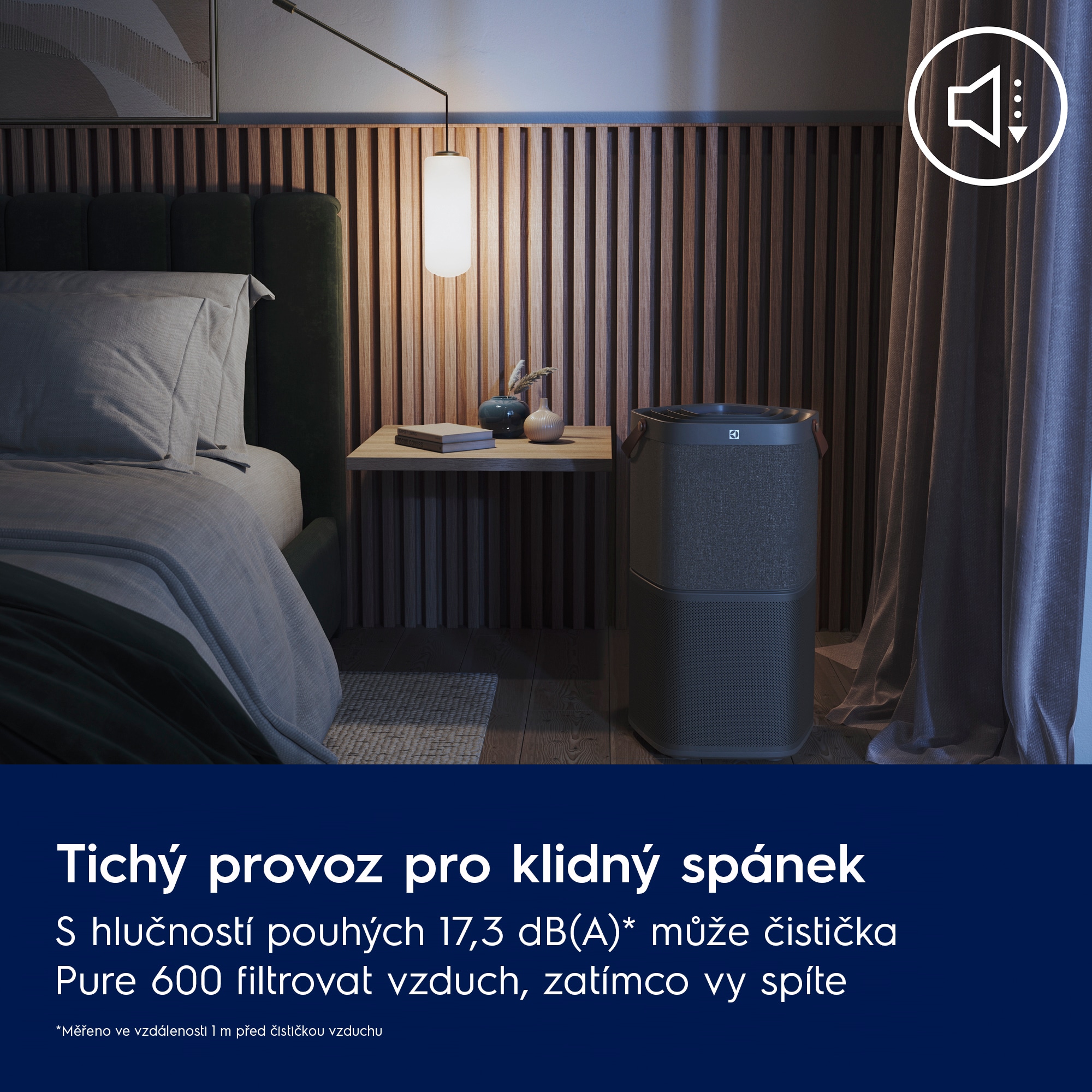 Ideální pro velké prostory: Pure 600 díky míře dodávání čistého vzduchu (CADR) 520** a výkonnému spirálovému proudění vzduchu systému AirSurround vyčistí vzduch v místnosti o ploše 108 m2** za méně než 4,24 min*. Filtr s aktivním uhlím neutralizuje formaldehyd a další prchavé organické látky.
