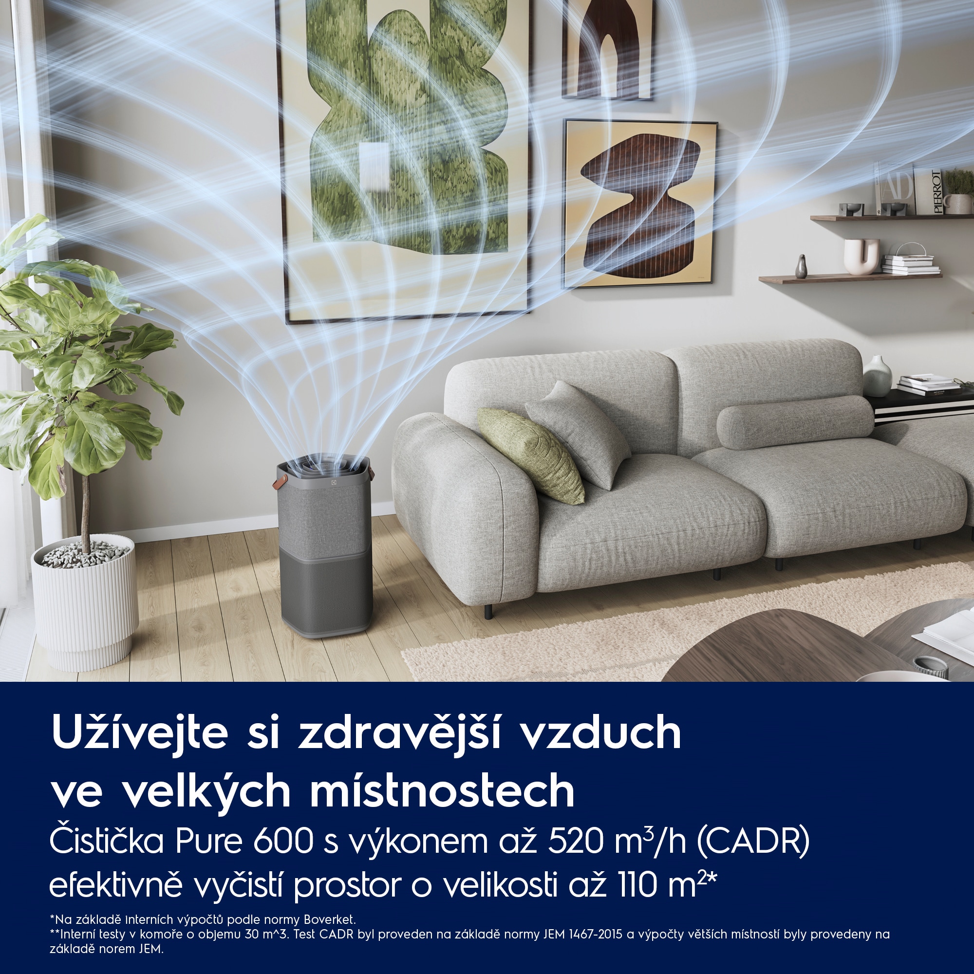 Ideální pro velké prostory: Pure 600 díky míře dodávání čistého vzduchu (CADR) 520** a výkonnému spirálovému proudění vzduchu systému AirSurround vyčistí vzduch v místnosti o ploše 108 m2** za méně než 4,24 min*. Filtr s aktivním uhlím neutralizuje formaldehyd a další prchavé organické látky.