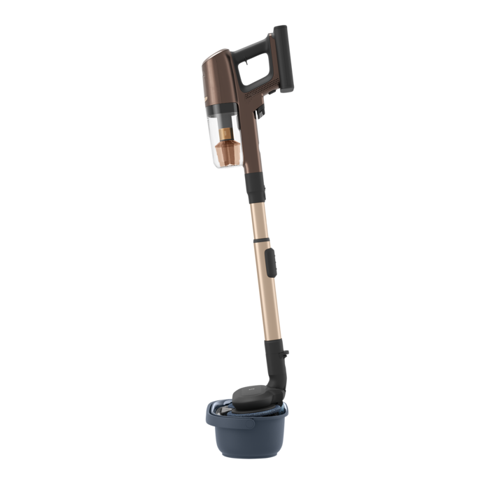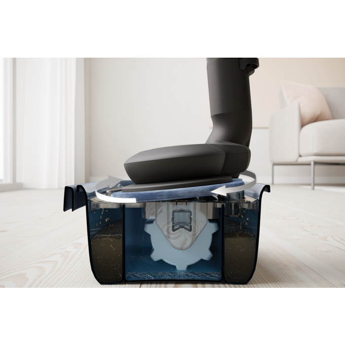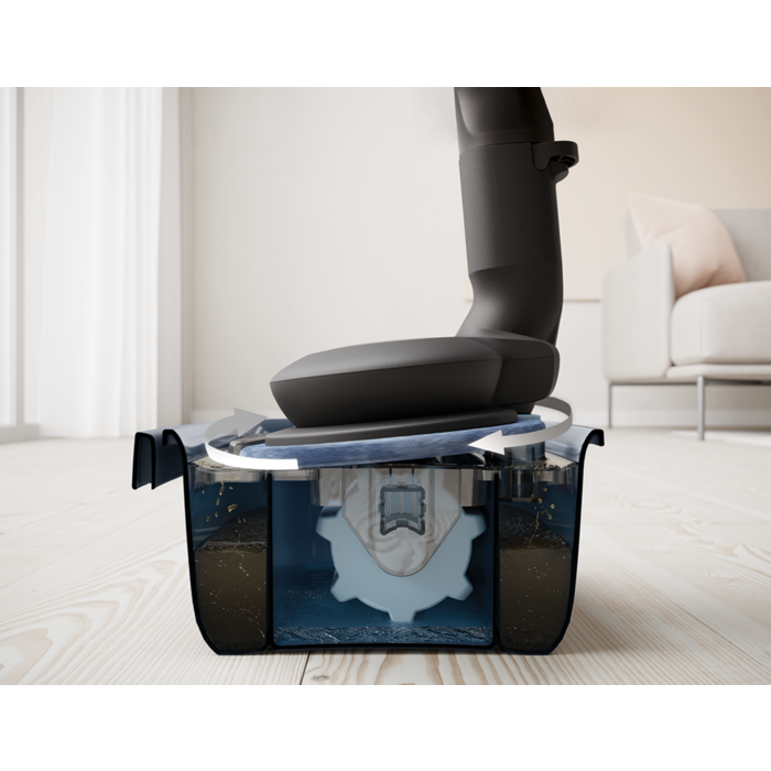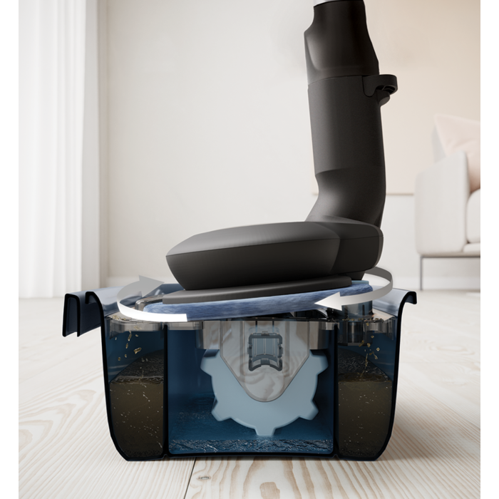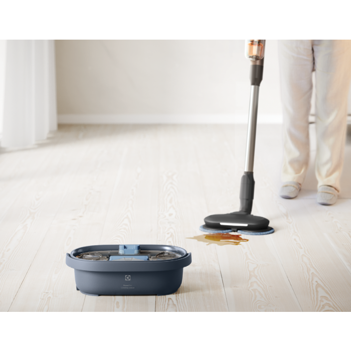 . Elegantně opláchne, vyčistí a vyždímá mopovací hubici.