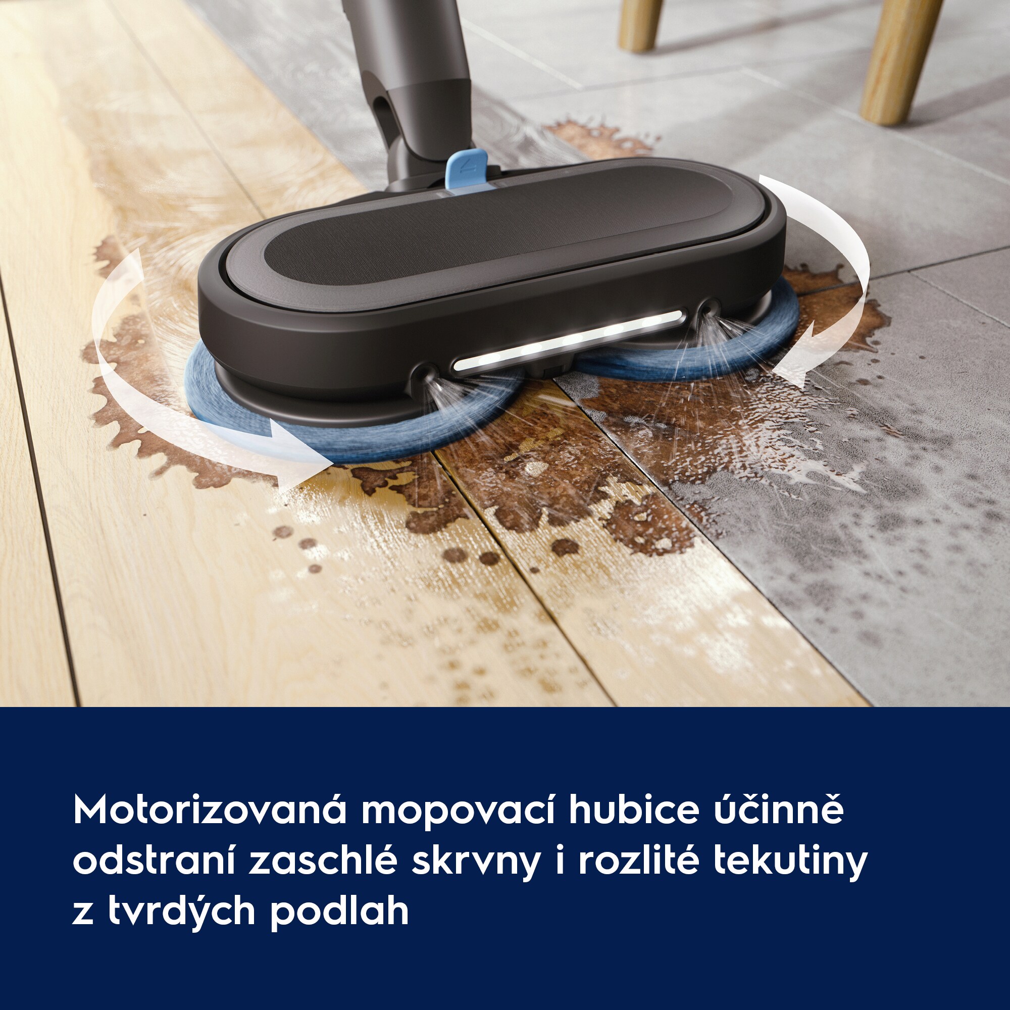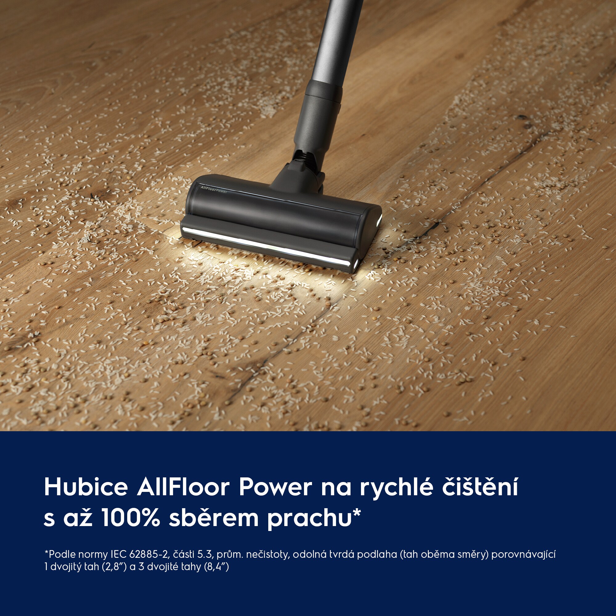 * Podle IEC 62885-2 část 5.3 prům. nečistoty, odolná tvrdá podlaha (tah oběma směry) porovnávající 1 dvojitý tah (2,8″) a 3 dvojité tahy (8,4″)