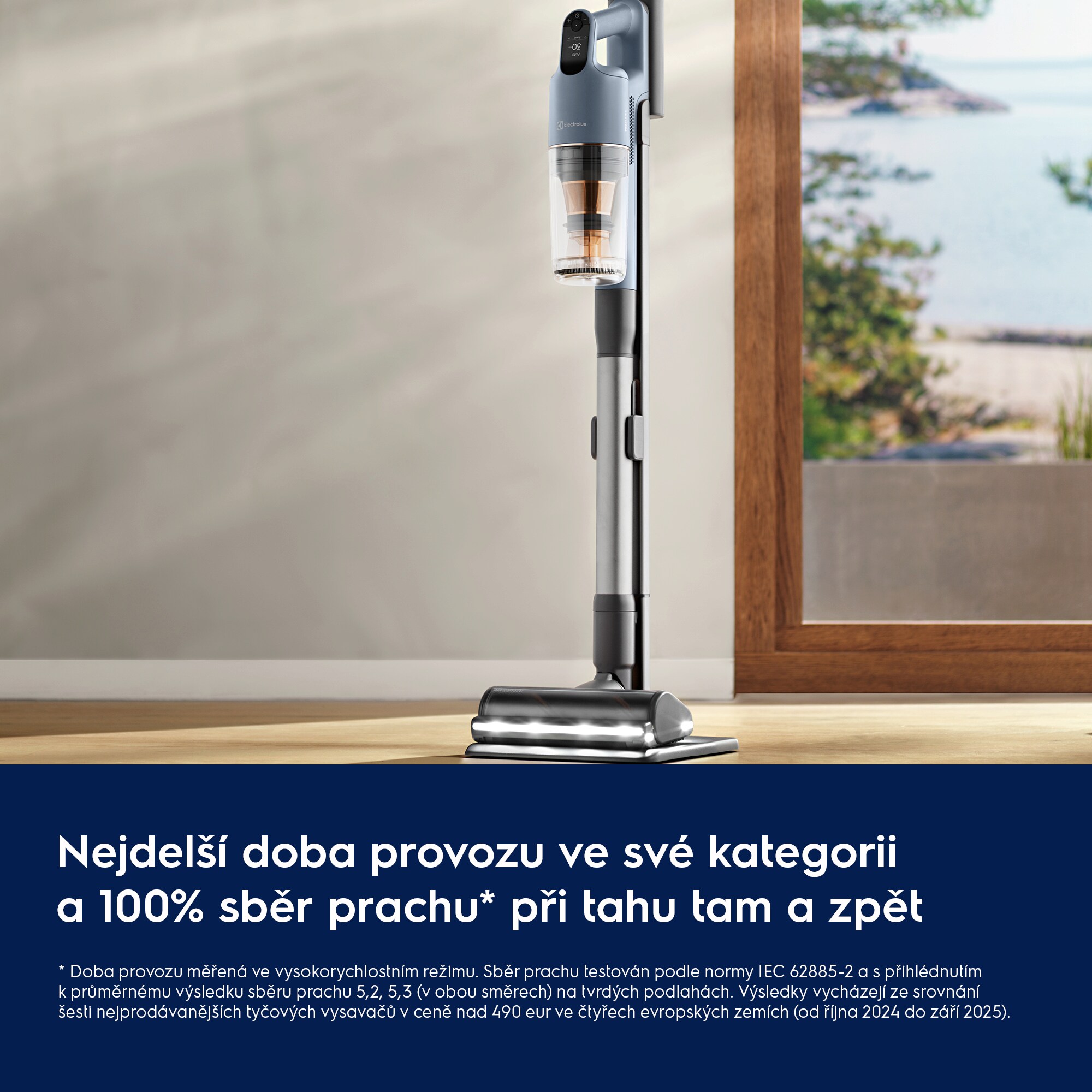 * Doba provozu měřená ve vysokorych. režimu. Sběr prachu testovaný podle IEC 62885-2 s ohledem na prům. výsledek sběru prachu 5.2, 5.3 (oba směry) na tvrdých podlahách. Výsledky vycházejí ze srovnání 6 nejprod. ručních vysavačů v ceně nad 490 eur ve 4 evropských zemích (od října 2024 do září 2025).