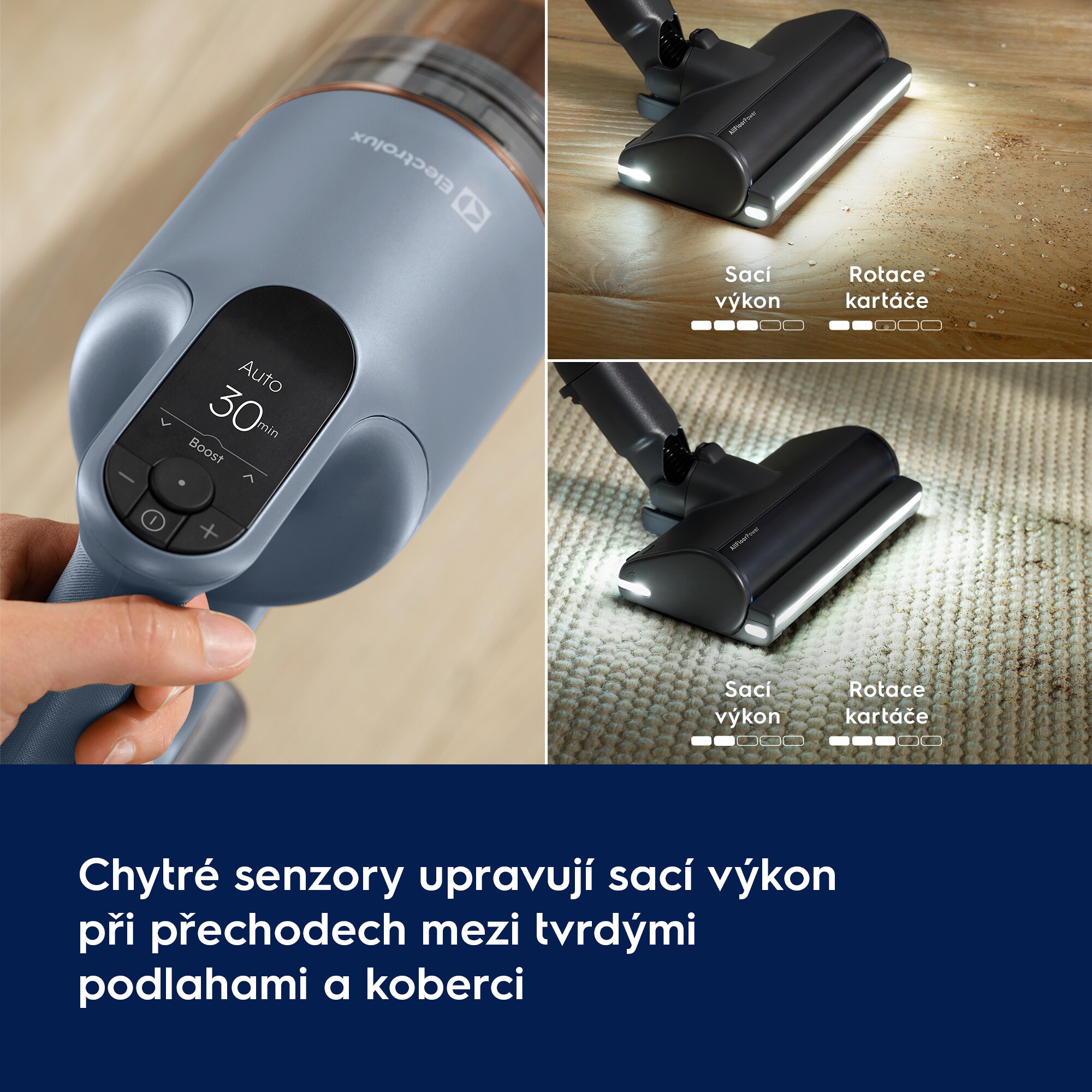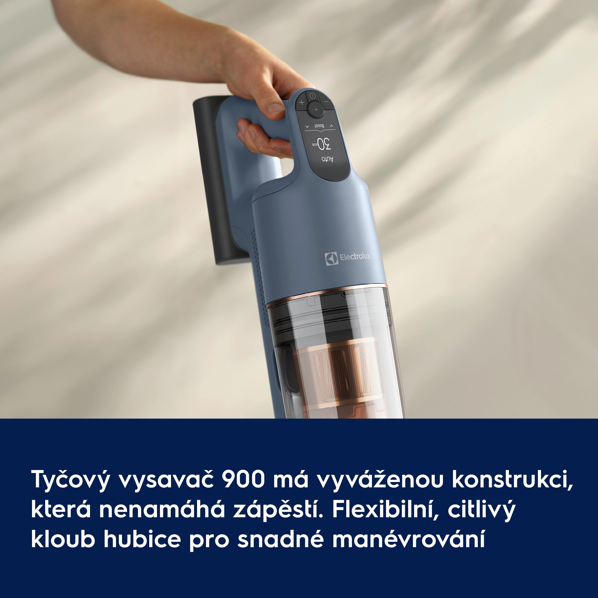 Efektivita, která vydrží. Tyčový vysavač 900 s hubicí AllFloor Power je jediný tyčový vysavač, který spojuje nejdelší dobu provozu ve své třídě s až 100% sběrem prachu.*