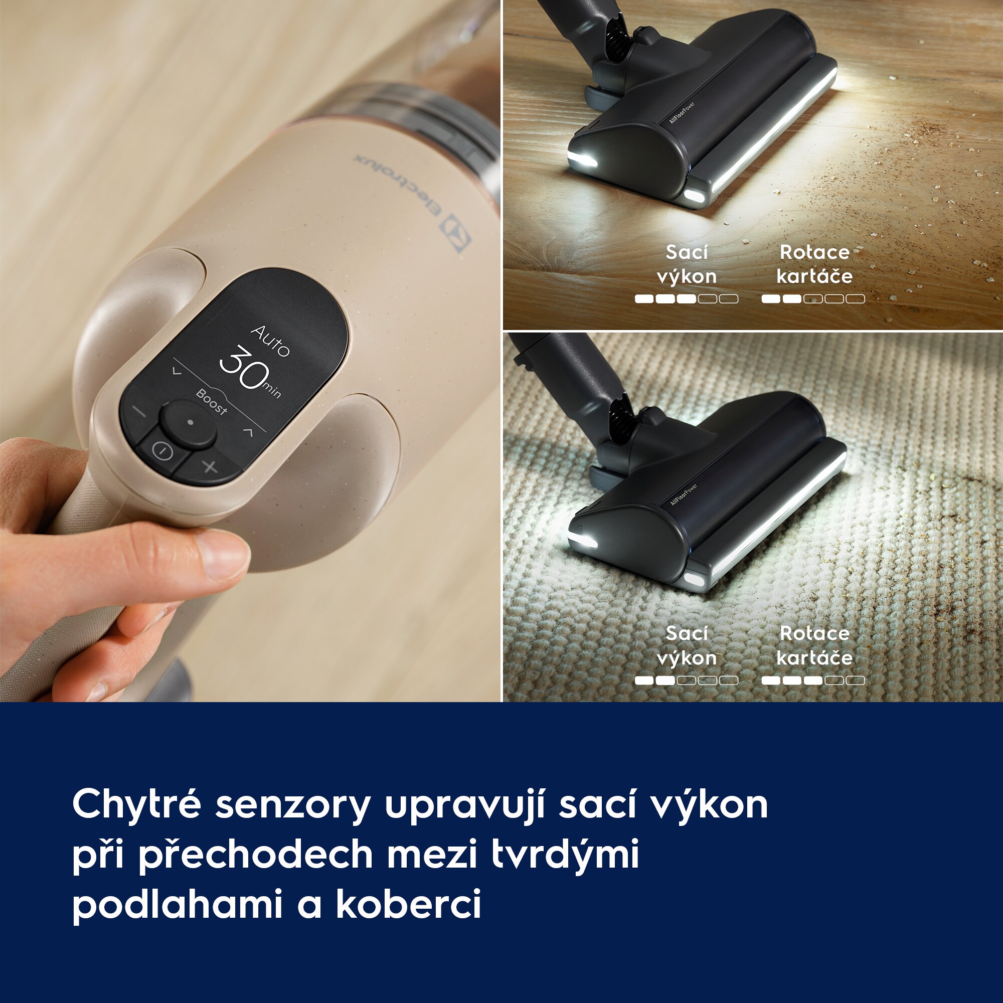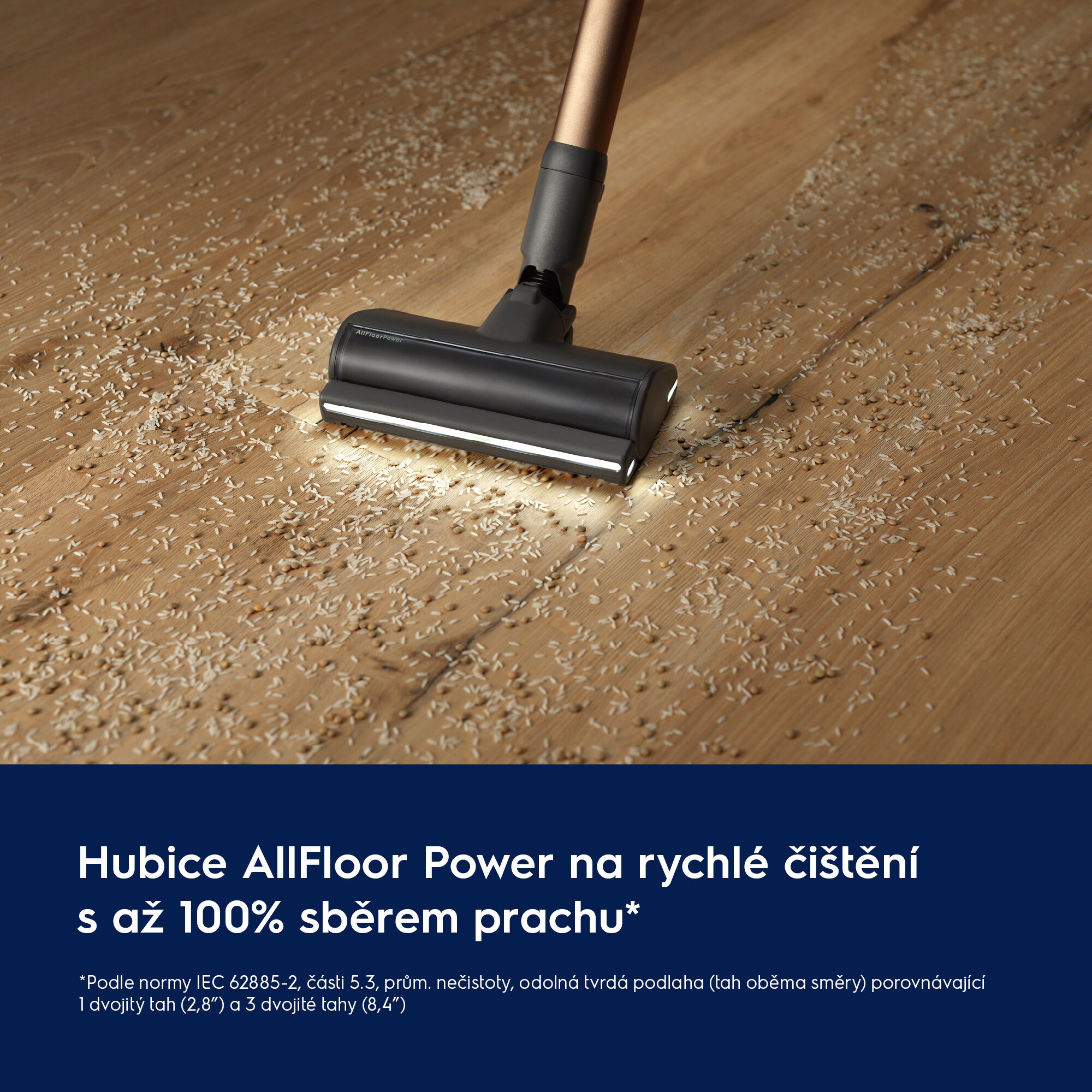Nová hubice AllFloor Power zachytí až 100 % prachu*. Výkonný bezkartáčový motor a inovativní gumové proužky zajišťují účinnost při tahu vpřed i vzad pro rychlé vysávání. Jedinečné 360° LED osvětlení odhalí skryté nečistoty. Systém proti zamotání neustále vymotává vlasy z kartáče.