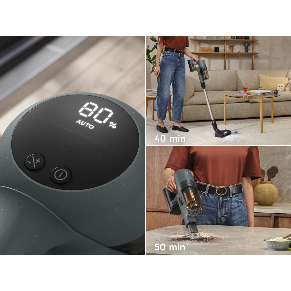 * Ve srovnání s provozní dobou v režimu Boost. ** Na základě interních testů podle normy IEC 62885-4, které měřily dobu vysávání ruční jednotkou a celým vysavačem v minimálním režimu.
