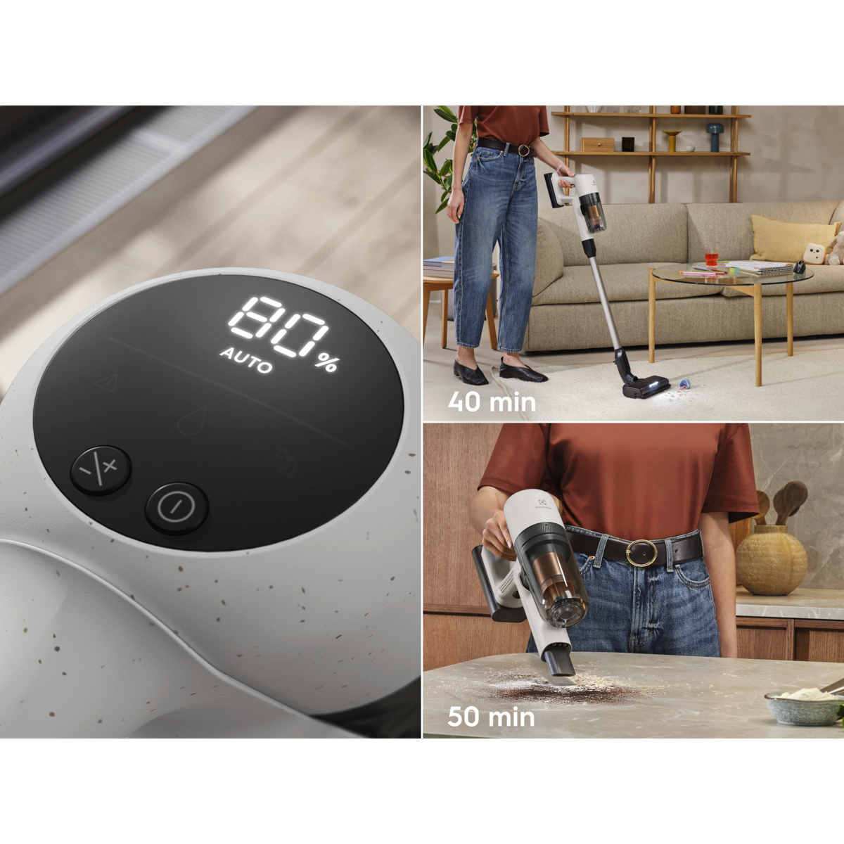 * Ve srovnání s provozní dobou v režimu Boost. ** Na základě interních testů podle normy IEC 62885-4, které měřily dobu vysávání ruční jednotkou a celým vysavačem v minimálním režimu.