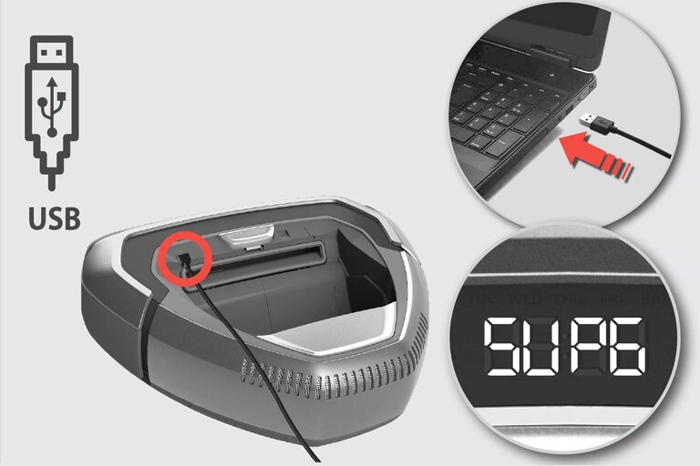 Krok 3Propojte robota kabelem micro USB k vašemu počítači. Počítač rozpozná robota jako USB paměťové zařízení. Na displeji robota se zobrazí „SUPG“. (Ujistěte se, že používáte USB kabel, který neslouží pouze k nabíjení ale také k přenosu dat.)